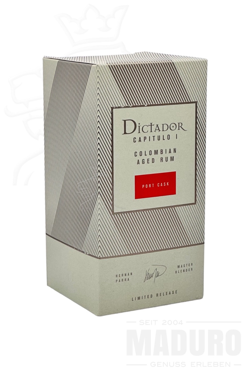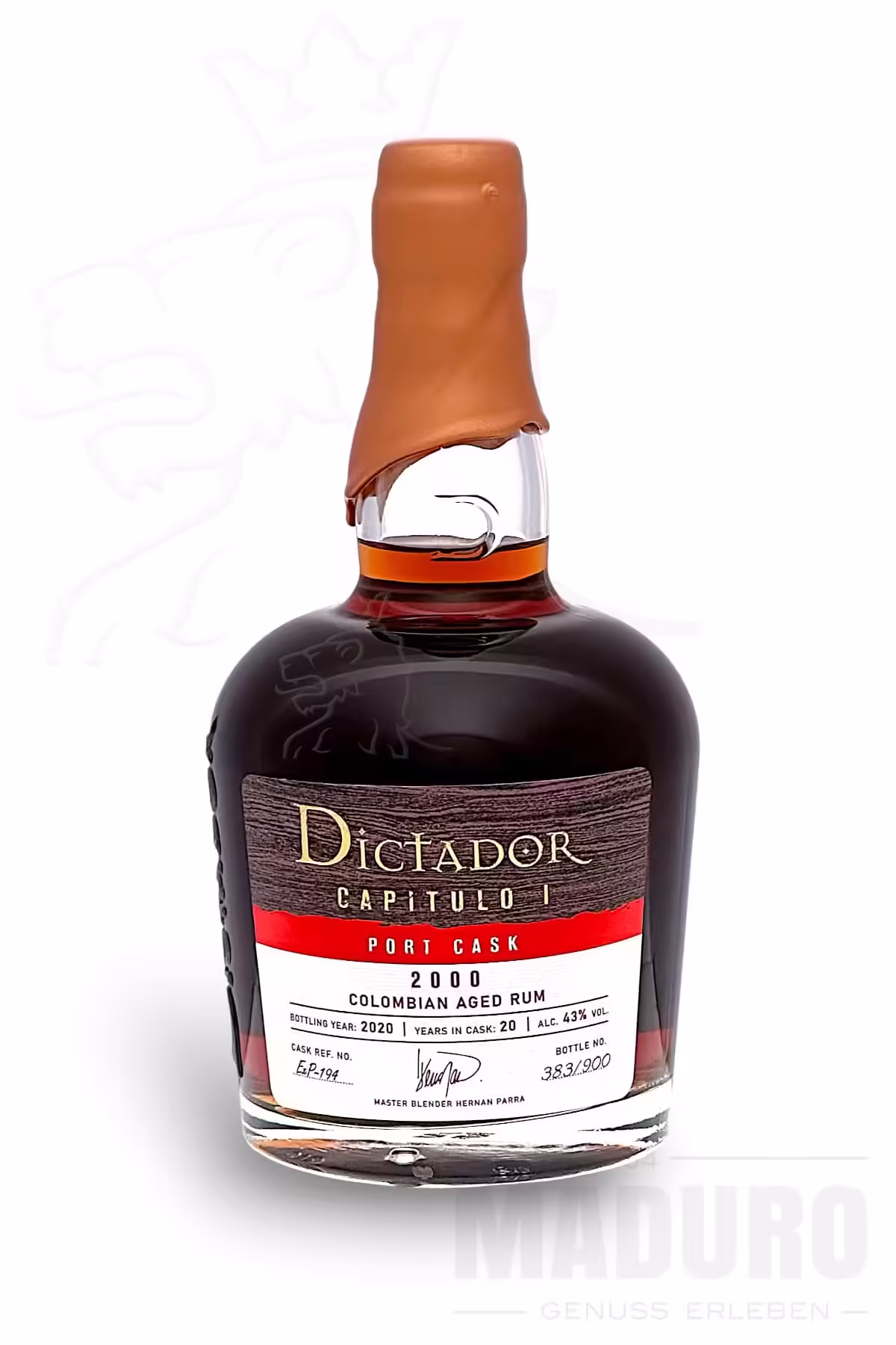 Der Dictador Capitulo Rum ist eine Serie von Rums, die in amerikanischen Eichenfässern reifen und ein Finish in verschiedenen Fasstypen, darunter Port und Sherry Fässern, erhalten. Dieser Dictador Rum reifte für 20 Jahre. Er wurde 2000 destilliert und 2020 abgefüllt. Sein Finish erhält er in einem portugiesischem Portweifass. Die Produktion wurde auf 900 Flaschen limitiert.