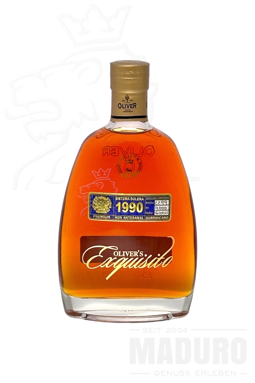 Dieser Melasse-Rum aus dem Jahre 1990, wurde mit jüngeren Rums zu einem Durchschnittsalter von 25 Jahren vermählt. Ausserdem ist er jährlich nur in limitierter Edition zu erhalten und einzeln von Hand nummeriert.Das Rumhaus Oliver & Oliver ist ein Begriff unter Liebhabern von Melasse-Rum. Der Hersteller ist aus der Rumwelt nicht mehr wegzudenken. Oliver und Oliver eroberten mit Kreationen wie Opthimus, Quorhum oder Presidente Marti ihren Platz im Rumregal. Die Spezialitätenreihe Olivers Exquisito bietet insgesamt drei wundervolle Solera Rums aus der Dominikanischen Republik: Soleras 1985, Soleras 1990 und Exquisito Soleras 1995.